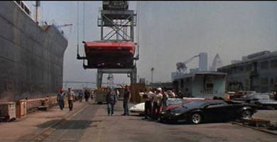 The producers of RAIN MAN had some reason to need a matte painter for that car-unloading shot - I don't recall what it was that Mark told me was the specific purpose, but it may have been that the cars and the crane were real but they didn't want to film on a real dock with a real ship. When Sullivan painted in the skyscrapers in the background he cheated reality, because as every Angeleno knows, the docks of L.A. Harbor aren't next to the tall buildings of downtown. Mark knew his painting would look so photo-real to viewers that he added the familiar City Hall building just to prove that the shot wasn't real. It is indeed the same famous building from DRAGNET, and the same one the Martians of WAR OF THE WORLDS blow up with their heat ray.