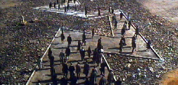 John Patrick Shanley plays all kinds of cute visual games in Joe, that are nicely introduced on the fan site mentioned above. The duck-as-devil is the cutest. But the one everyone catches at least partially is the repetition of the lightning bolt symbol in the logo of the American Panascope company, where downtrodden Joe Banks wastes his days under those fluorescent lights that, "suck out his brains ...shhhhp, shhhp." There's a big 'hey' that goes through your jead when you realize a fairly sophisticated game of visual echoes is being played ... the same zigzag lightning bolt pattern can be seen in the procession of Waponis climbing to the volcano (top of page), and even in the lighting that sinks Patricia Graynamore's (Meg Ryan) yacht. Look closer, and it is even in the cracked walls of Joe Banks' crummy apartment.