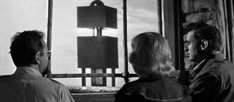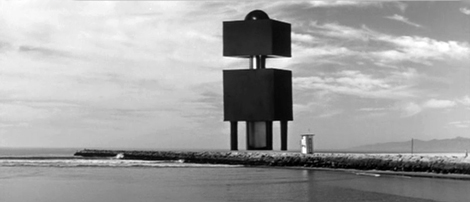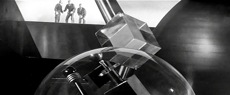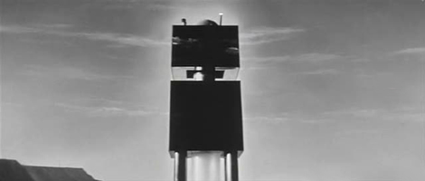 A special treat from Image last week was the DVD debut of the most over-achieving low budget Science Fiction films of the 50s, Kurt Neumann's Kronos. Wade Williams has added the subtitle "Ravager of Planets" for some brainless purpose, but he can be forgiven for two happy reasons - the movie itself is intact and 'unimproved' (see Invaders from Mars and Rocketship X-M, and the quality is top-notch. Savant finally saw this film letterboxed in CinemaScope on AMC television a few years back, and it looks even better on this DVD release. The notices of Kronos were all positive - contemporary reviewers were impressed by its special effects and thought the film the equal of many a much higher budgeted effort. By 1957 the A-picture high-class Science Fiction film was a fading dream, and Kronos' immediate competition were groaners like The Unknown Terror. Interestingly enough, the same men who made Kronos had previously written the script for one of the last A-budget Sci-fi classics. Irving Block and Jack Rabin ran an all-purpose optical service in the 50s that thrived on the slew of independent productions without access to studio optical departments. Their work is everywhere, from awful $50 visuals in things like Monster from Green Hell to brilliant work in Night of the Hunter. Creative and ambitious, the duo made a big sale to Dory Schary at MGM - their Fatal Planet treatment eventually became Forbidden Planet, one of the few Science Fiction films with a bona fide abstract Science Fiction concept at its center. Forbidden Planet's tale of an alien society whose self-perpetuating machines become a menace millennia after their own extinction, was a 'Big Idea.' Some of the film's strongest scenes were non-narrative contemplations of the vast and unknowably complex 'instrumentalities' of the alien Krel race. When Dr. Morbius points to miles of air shafts and the opening and closing of countless relays, Block and Rabin's visionary super-machine resembles a modern computer. In its tying together of the entire planet of Altair-4 it also evokes a vision of the Internet. Kronos is a Big Idea movie as well. Its star is a titanic cubic Tinkertoy, a robot from outer space sans face or personality. Its menace is completely impersonal and its mission is to drain every erg and kilowatt of energy from the Earth for the benefit of its unseen controllers. The storyline is pure pulp Sci-fi, with an emphasis on Possessed by a jolt of electricity from a fallen meteorite, a truck driver breaks into a desert research institute called LabCentral. The electrical life form transfers itself to the head of the lab, Dr. Hubbell Eliot (John Emery), who from then on functions as a double agent for unseen aliens. He covertly directs the landing of a strange machine, Kronos, and then guides it on an uniquely weird mission to 'sap the Earth of every drop of energy.' LabCentral's top scientists (its only staff, judging by what we see) go to Mexico to monitor the fallen object and discover that Kronos is actually a machine, two upright cubes topped by a dome, It stands on piston-pile driver legs. They briefly inspect the robot's interior by landing a helicopter on its top. Kronos' futuristic contents betray nothing of its intended function until, guided from afar by Dr. Eliot, it starts seeking out power plants to raid. The robot robs energy by using plasma storms of electric bolts and ray blasts. Waves of energy flow and ebb across the skies as it literally vacuums up every iota of power to be found. A B47 is dispatched to bomb Kronos just as our heroes determine that nuking the monster would counterproductively feed it more energy. But Kronos employs a pre-Star Trek tractor beam to pull the bomber to its target - and emerges from the radioactive cloud exponentially larger, seemingly a mile or more tall. A last-ditch solution is cobbled together only as Kronos, now an unstoppable colossus, nears panic-stricken Los Angeles. The Kronos robot is a wonderfully compact Science Fiction concept. Described at one point as an 'accumulator', Kronos is infinitely interpretable as a comment on gluttonous consumerism but more easily represents exactly what it is, an impersonal mechanism by which a higher technological culture feeds off a lower one. Like Brazilian Indians watching their rain forest snatched away acre by acre, humans fret helplessly as Kronos steals Earth's resources. Science is nifty, but its tools are suspicious, even the ones on our side. LabCentral's computer SUSIE isn't traitorous like the top secret computer into which the aliens hack in GOG, but it still can't be trusted any more than can Kronos itself. Kronos is a subversive fantasy and Kronos itself a powerful symbol. The titan's design is brilliant. Its simple collection of shapes has no style and no personality. It defies analysis. Surely Stanley Kubrick learned his 2001 lesson here; like Arthur Clarke's Monolith, Kronos doesn't date. In this movie, kids, Earth is invaded by Abstract Art from outer space. Every view of Kronos remains fascinating. 1 It stands on the horizon, its head in the clouds, an unexplainable manifestation of an unknowable Future. (see image below) Once the action gets going, Kronos is an unbroken series of unique and weird special effects sequences accomplished through simple opticals and superior design. Cel animation is used for a few shots, which have always been criticized by scoffers who didn't want animated cartoons in their Sci-fi films. Today, that's almost all there is to special effects. The giant glowing shape glimpsed on the Pacific horizon is yet another architectural dome menace from 1957 (the others are The Mysterians and Quatermass 2). The camera pans across convincing matte paintings that show Kronos plowing giant grooves into Mexican valleys with its giant piston feet. Kronos' physical mobility is almost as unlikely as the broccoli monsters of The Day of the Triffids. Perhaps the pistons level a path, and Kronos really hovers