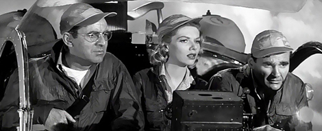 probably pulled the biggest scientific boner of all time?" Other details show the lack of coordination that crops up in movies made too fast or without adequate supervision. The Metaluna Factor, as Savant calls it, is when your characters describe subtle things like slight indentations on the foreheads of people who may be aliens ... and then when the aliens actually show up, they have bulbous domes three inches taller than anything human. Somehow the script people and the production designers weren't talking to each other. The UFO in the beginning of Kronos is monitored on a mysterious telescope scanner that plays its progress like a television, with automatic cuts. This doesn't exactly count as a flaw, because surveillance cameras that follow people and even edit their views still show up in movies. But Kronos has quite a few other head-scratchers. While the robot is still a curiosity standing passively on a beach, newscasters (played by real L.A. newscasters, a nice touch) hold up sketches for the TV cameras. The first sketch makes Kronos look like an espresso machine, a nice touch if it's meant to be unreliable reportage. A bit later, a rendering by an apparently clairvoyant artist shows a (very ad art-looking) full-sized colossus on a rampage, the monster that Kronos has not yet become. When the possessed Dr. Eliot tells his associates how to defeat Kronos they record his words. We see the tape recorder start rolling a sentence or two after the doctor's starts talking, but when the tape is replayed, his whole speech is recorded. The psychiatrist (Morris Ankrum) is electrocuted at an indoor transformer power station, presumably the kind that serves a large building. But this hospital's transformer substation is located in the office of the head of Psychiatric Treatment, a few steps from his consulting desk. Is the good doctor using his spare time to conduct shock treatment trials on elephants? On Kronos' trek through Mexico there are numerous cutaways to stock footage obviously filmed in Hawaii. Panicked citizens in Hawaiian shirts run through the hills of Oahu. A very nice effects shot shows Kronos threatening a sugar-cane field as hundreds of Hawaiians flee in panic. If Savant is not mistaken, the depression in the hills behind Kronos in this shot is Kolekole Pass, the infamous route taken by the torpedo planes that bombed Pearl Harbor! Block and Rabin must have had cheap access to some CinemaScope stock footage from an unknown Fox film set in Hawaii. Another clue that Kronos was an 'on the lot' Fox film is the use of the pop song 'Something's Gotta Give' as soundtrack source music. LabCentral also sports parts of sets constructed for the Fox films Desk Set and The Day the Earth Stood Still. Two of Kronos' sublime moments revolve around the atom bomb. When the alien tractor beam draws the B47 inexorably into an H-blast, the angles and cutting enforce a sense of impending doom, until the screen whites out at the point of impact. The effect prefigures the Yahoo bomb scene in Dr. Strangelove and works almost as well. The conclusion of Kronos is another thing altogether. Here the Metaluna Factor has its purest expression, or maybe it's a private joke that Block, Rabin and director Kurt Neumann couldn't resist. Our scientist heroes look on gleefully as their dime store physics succeed in making Kronos melt and crumble like the Krel door in Forbidden Planet. Then suddenly, Kronos erupts in a nuclear explosion, a giant stock shot blasteroonie. This is happening right in the middle of Los Angeles, not out in the desert somewhere - it looks to Savant like Kronos is standing either in Toluca Lake, or behind Dodger Stadium. And our heroes must be watching from only a few miles away, perhaps the tower at the Burbank Airport. A few seconds after the devastating blast, sidekick Arnie cheerfully tells Gaskell and Vera that they still might make it to a late show! Wearing what? Radiation suits? This had to be a joke. Image's DVD of Kronos is a clean non-enhanced transfer from good elements. Scratches and damage are minimal. Most of the schmutz on the copious stock footage on view was probably there when the film was new. The mono track is exceptionally clear and the aural detail in the very-busy destruction scenes is striking - this was the first time Savant could hear those transformers blowing as Kronos blacked out grid after grid of Los Angeles power. An effective trailer is the only extra. The package artwork is pretty dismal, with an especially grotesque rendering of Jeff Morrow. But it is loud and colorful. How come cheap 35-cent 1950s pocketbooks could have stunning oil-painting covers, whereas our DVDs are largely garish paste-up Photoshop rejects? This is for you, Mr. Wade ... Far too many 50s invasion films are to laugh at, but Kronos delivers a fascinating concept and a stunning production that transcends its own silly dramatics. The Tinkertoy from outer space is really a cosmic Golem that has remained compelling thanks to superior design and special effects. Savant rates Kronos an A-, right up there under the top classics of the Science Fiction genre. With its impressive letterbox presentation, Image's DVD is a highly desirable title.