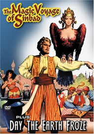 If Coppola sought to rip-off the success of 7th Voyage of Sinbad by retitling the very non-Arabian Nights tale Sadko, American International followed up with an even less defensible stretch. Sampo takes place in a fairy tale setting and follows the strife between an evil witch and a peaceful village; AIP sold it as The Day the Earth Froze, making it sound like the popular science fiction movies The Day the Earth Stood Still and The Day the Earth Caught Fire. Sampo is from 1959 but is just as basic in its storytelling as was Ptushko's previous fantasy. The AIP version appears to have been trimmed by a couple of reels and uses narration by Marvin Miller to hold its story together. The hero this time has no particular distinction except being blonde and skilled in running river rapids while balanced on a log. The similarly golden-haired Annikki is straight out of the fairy tales. Wild animals come from the forest to cuddle with her and birds perch happily on her fingers. When she walks, flowers instantly grow out of her footprints, much to the ire of Louhi's gnome-like henchmen. The film is darker and less lavish than Sadko but still has many impressive sets in the witch's polar kingdom under the Northern Lights, where trolls and wizards labor in underground workplaces. The theme has been updated from the Joe Stalin years ("I'm your leader, don't ask for favors") to the yearning for consumer goods in the Khruschev period. Everyone desires a Sampo, a kind of magical crystal heap that provides material goods (salt, flour, gold) by verbal command. One can't help but remember the Premier standing before some washing machines in NYC with Richard Nixon trying to be a friendly host; the message of Sampo seems to be that wishing for luxuries to make life easier is just asking for trouble and that people should stay in their little villages and stop grousing. The witch Louhi wants a Sampo as well, and her kidnapping of Annikki puts into motion a series of fantastic events. The special effects are managed more through clever design than hi-tech means. Louhi sends one of her evil black cloaks into the skies, and it becomes a black sail on the boat that whisks Annikki away. Her blacksmith brother forges first a glowing scarlet horse to plow the field of snakes (a nice effect), and then a sturdy iron boat with a masthead that looks like Bullwinkle the Moose. The Sampo itself is a crystalline oven with animated colored glows dancing about it. Even more interesting is a huge chamber where the imprisoned Annikki finds the four Winds held captive, bound up in canvas and heavy chains. They speak, imploring Annikki to set them free. It's a unique fantasy situation given a good treatment. Some effects are simply functional but the occasional scene can be very surprising. At one point a character leans up against a stone door and turns to stone as well. Lemminkäinen uses a magic sword to hack the door in two, and the person splits in two at the same time. The source story is said to be Finnish and the movie is a Soviet-Finnish co-production. It has been cut down by quite a bit, so presuming much from it about the original is probably not wise. American fans are going to relate to the title through a parody version shown on Mystery Science Theater 3000, one of the funniest episodes ever. All the characters keep whining about the lack of a Sampo ... I just remember my kids thinking it was terrific. If the MST3K is how you relate to old movies, you'll have to supply your own jokes for this one. Retromedia's double bill of The Magic Voyage of Sinbad and The Day the Earth Froze is a good encoding of good transfers of what appear to be original materials in good condition. It's not going to substitute for seeing the originals, but fans of bizarro import mutations of the kind usually available only as gray-market tapes, are going to be pleased. The cover art duplicates the key poster for Magic Voyage that puts Sadko in an Arabian Nights costume and gives the Phoenix bird a drastically altered plunging neckline. Sorry, but in the movie the humanoid buzzard doesn't have breasts.