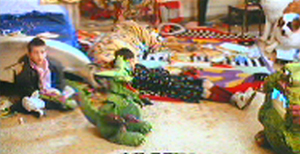 3) Claire Tourneur's (Solveig Dommartin) lost weekend or whatever it is in Venice lasts about ten minutes longer as she gathers her belongings and tries to get out of her boyfriend's lavish digs. On her way she picks a path through some broken glass, and stumbles into a room where two children are playing with some hi-tech dinosaur (or robot?) toys. We also get a much better look at the jetsetters and party lizards hanging about.