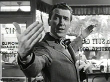 If you can imagine the movie playing as a straight narrative, you can see the problems it would impose on the story structure. Picture Capra squirming through his assemblage of ninety expository minutes of Stewart's adventures as a child and young man, realizing that it is all basically directionless. Suddenly, when Clarence the Angel drops in out of nowhere, Life becomes a cockeyed fantasy. An audience concentrating on the earlier scenes of George's fairly realistic and believable problems, would be taken totally off guard by the sudden addition of a fantasy element. A resentment factor can kick in when an audience has waited patiently for one story to shape up, and the movie suddenly takes a brand-new tangent inconsistent with what has gone before. If the tone changes radically the audience won't follow, and may in fact resent the whole show. This audience-resistance effect cripples the modern movie Prelude to a Kiss, in which a light romance suddenly decides it is a strange fantasy halfway through the film and without warning. Savant theorizes that Capra realized this was happening, and his agony must have been over how to make the film work when the budget had no more money for reshoots.