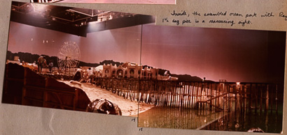 First to be filmed was the tremendous Ocean Park miniature, which completely filled one of MGM's largest sound stages. Modelmaker Milius Romyn's twenty-foot Japanese sub model cruised in the Esther Williams tank and fired cannon shells at a park consisting of fifty ornately detailed carnival buildings copied from the Santa Monica Pier and the Long Beach Pike. Explosions were done with flashbulbs and compressed air cannons, to produce blasts slow enough to be appreciated by cameras running only 48 frames per second; several structures had to be made exclusively from balsa wood so as not to produce a hail of shrapnel when ignited. Spielberg's famous order, 'Emulsify it!' became another buzzword on the miniature set. At the instigation of pal John Landis, ape effects man Rick Baker donned a gorilla suit at the end of filming and trashed some of the miniature buildings of Ocean Park as a tension-relieving gag. A still of this can be seen in the DVD supplement titled 'Comedy Relief'.