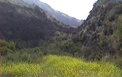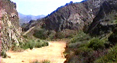 The quarry itself is actually not very large, but, like many film sets, looks gigantic, with towering walls of crumbling rock. Climbing is not recommended as the walls are very unstable. An art-director acquaintance of Savant working on The Sword and the Sorcerer once watched as a young stuntman wannabe leaped to his death on that film in a botched high-fall stunt. In Wim Wenders' unfortunate The End of Violence, the stunt woman dangled from a cable right here, with, if Savant remembers correctly, the Hollywood sign visible through that cleft in the hillside.