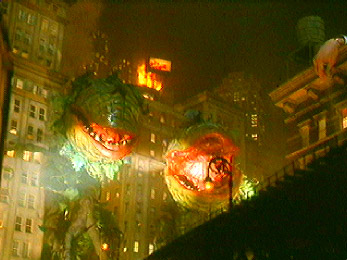 The first thing one thinks is, 'They cut this?' A gloss on the play's finale, 'Don't Eat the Plants,' the ending goes far afield of the little neighborhood where most of Little Shop plays out. Hordes of colossal Audrey IIs pulverize New York City, like Muppets gone mad. An affectionate takeoff on giant monster movies, the sequence is so good it betters the models it satirizes. The screaming crowds and destruction are the equal of Gorgo, and the design and photography are far more elaborate than similar scenes in Ghostbusters and Matinee. The workprint on